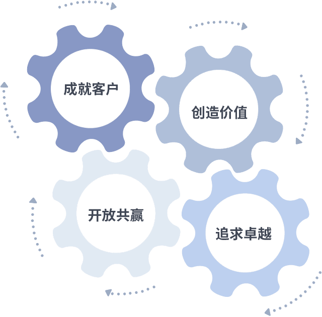 成就客户是一切决策的出发点,,,创造价值是衡量所有工作的标准,,,追求卓越是我们做事做人的态度,,,,开放共赢是我们的格局也是最终的结果。。。价值观的齿轮环环相扣,,,,推动着组织里的每个人不断向前。。。。
